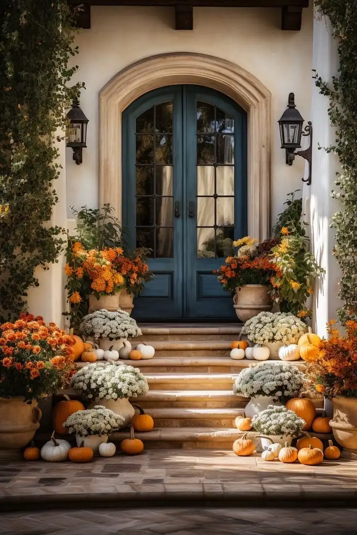 - Flanking urns: Place two tall urns on either side of the door. In each, combine slender grasses + one upright pumpkin + dried florals.