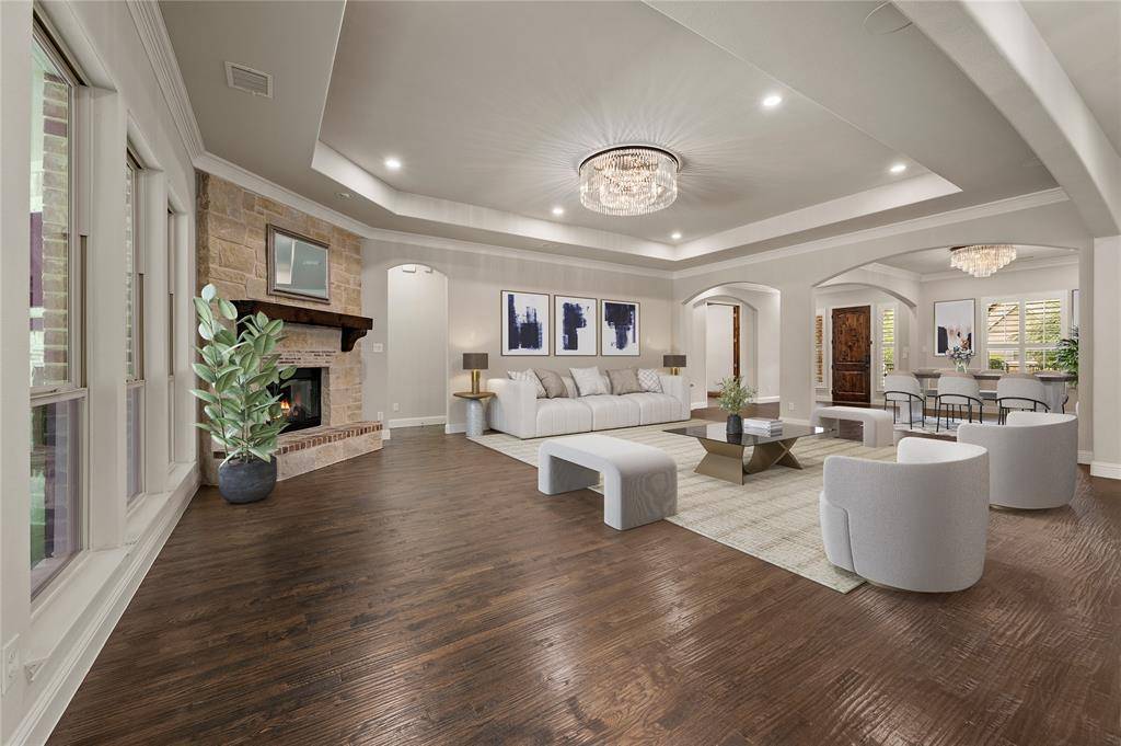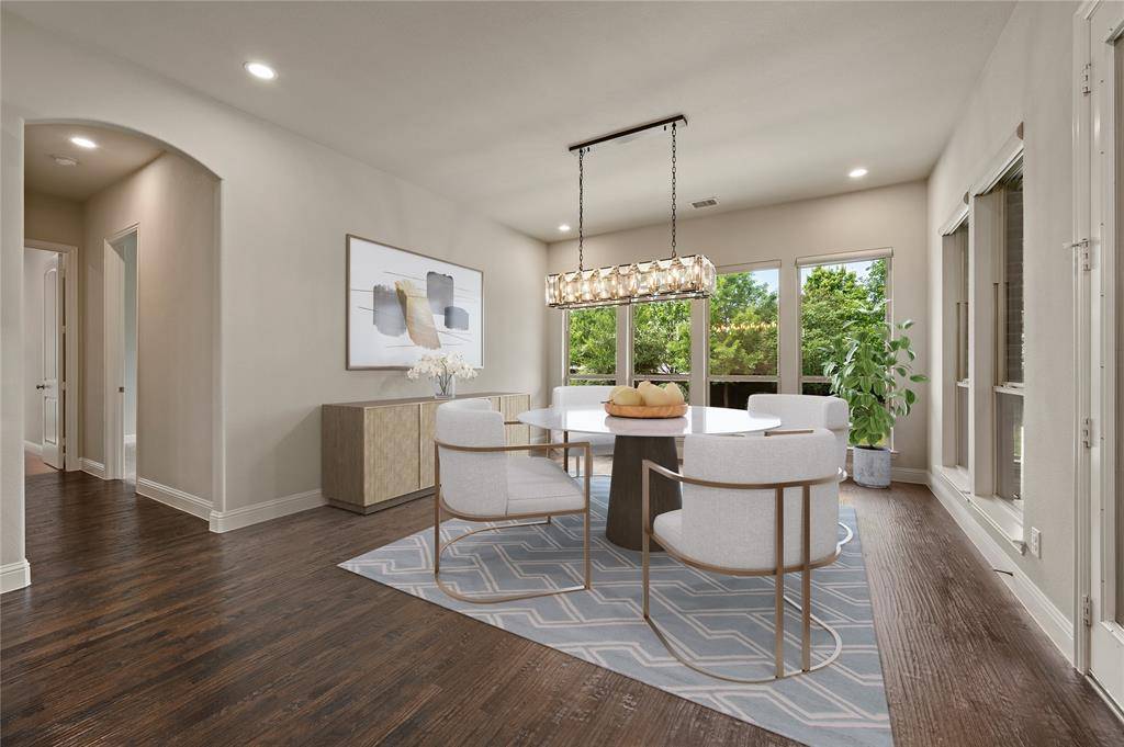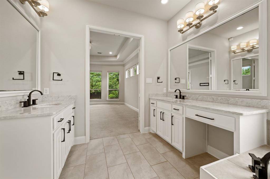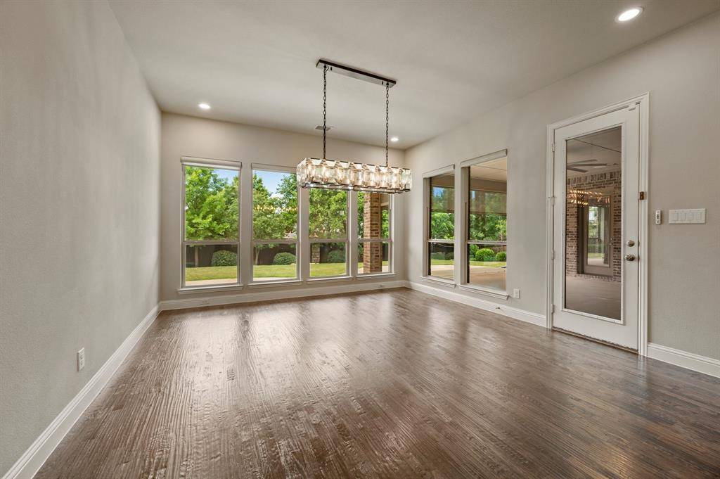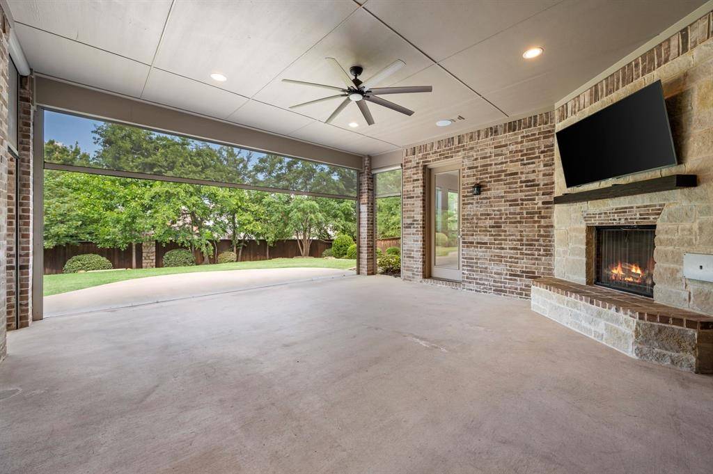 Sophisticated and timeless, single-story custom home in Carillon and Carroll ISD just minutes away from the much anticipated new Carillon Parc development, community pool, several neighborhood parks, playground, lakes for catch-and-release fishing and easy access to jogging and biking trails. The flexible and open floor plan offers 4 bedrooms all with en-suite baths and walk-in closets, a spacious office that could be another living area, media room, designer lighting, generous room sizes, mudroom with cubbies, pristine hardwood flooring and 3 car garage – single car is air-conditioned. The bright kitchen offers transitional design with gas cooktop, double ovens, island with seating, stainless steel appliances and large walk-in pantry. The media room comes fully equipped and offers a quiet retreat away from the other living areas and bedrooms. The oversized primary suite offers a serene retreat with remote room darkening shades, private access to backyard, dual vanities, double shower, soaking tub and spacious walk-in closet. Utility offers room for a refrigerator (included) and sink. The covered patio offers remote controlled screens plus a cozy fireplace for relaxing with family and friends. A short drive to Southlake Town Center for premium shopping and restaurants and to DFW airport.