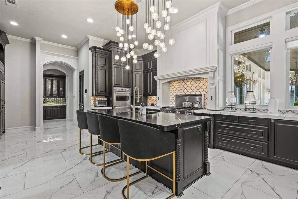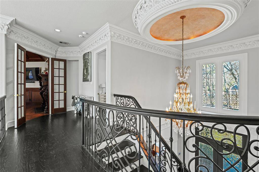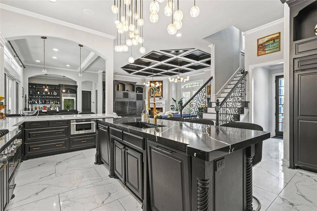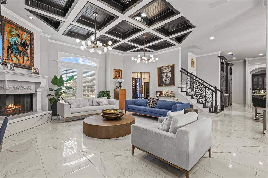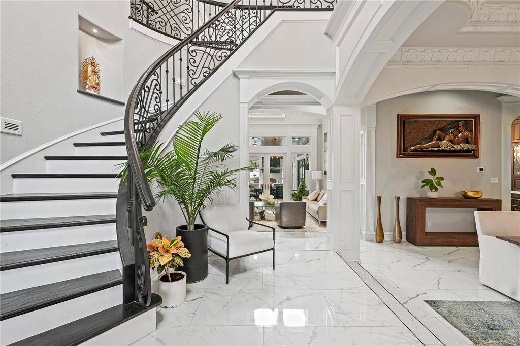 Thoughtfully renovated to blend modern sophistication with timeless architectural charm, this home showcases elegant crown moldings, coffered ceilings, and striking design details throughout. A grand sweeping staircase anchors the impressive foyer, flanked by a private executive office with custom built-ins and a hidden passage leading discreetly to the primary suite.