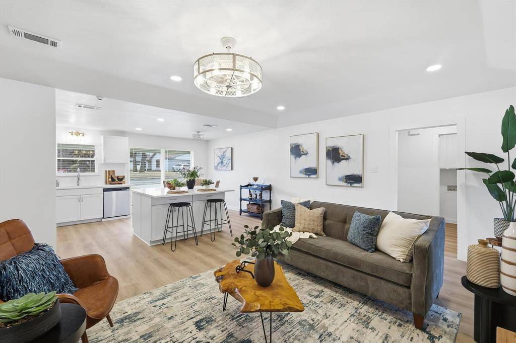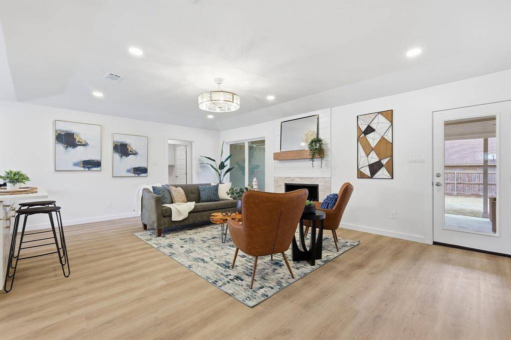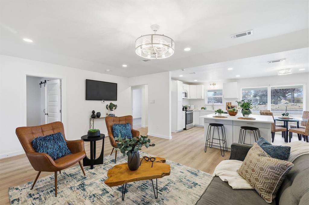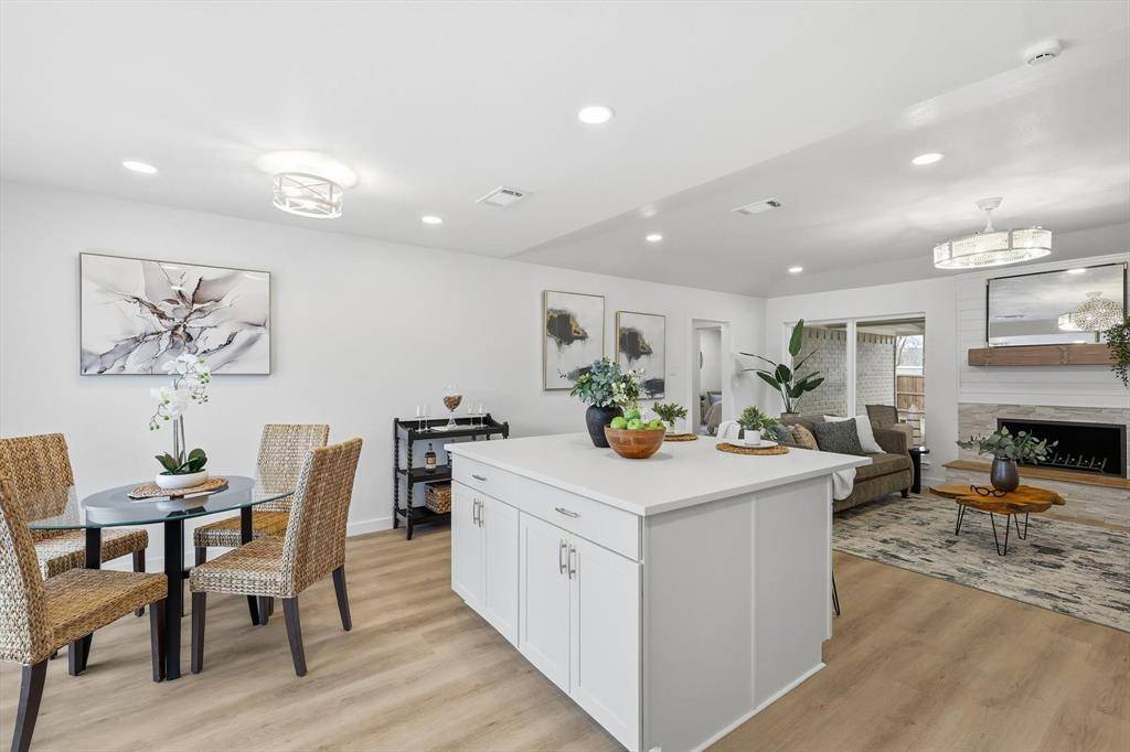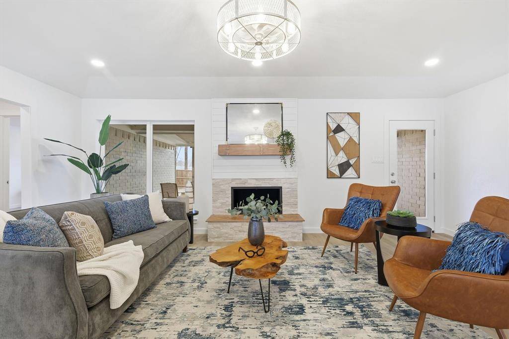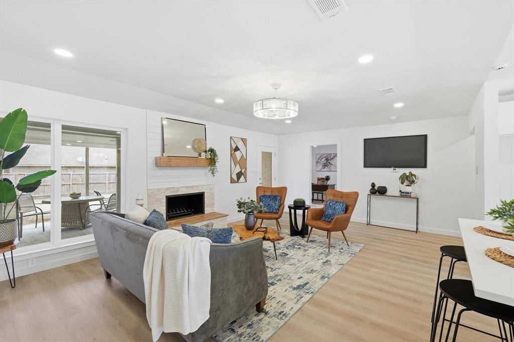 The open living area features a fireplace and flows into the updated kitchen with breakfast bar, island, and modern finishes. Spacious primary suite includes an ensuite bath and walk-in closet. Secondary bedrooms offer flexibility for guests, office space, or additional living needs.