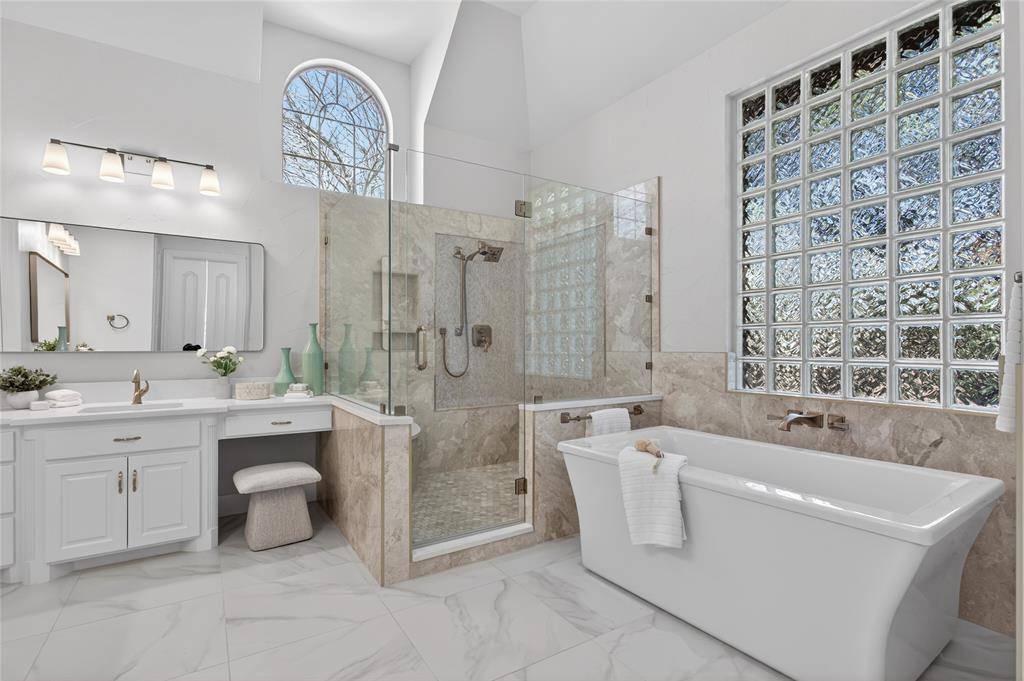 The primary suite is a luxurious sanctuary featuring a complete spa-inspired bath remodel and an exceptional custom closet. Two additional bedrooms are conveniently located on the first floor, offering options for guests or multigenerational living.
