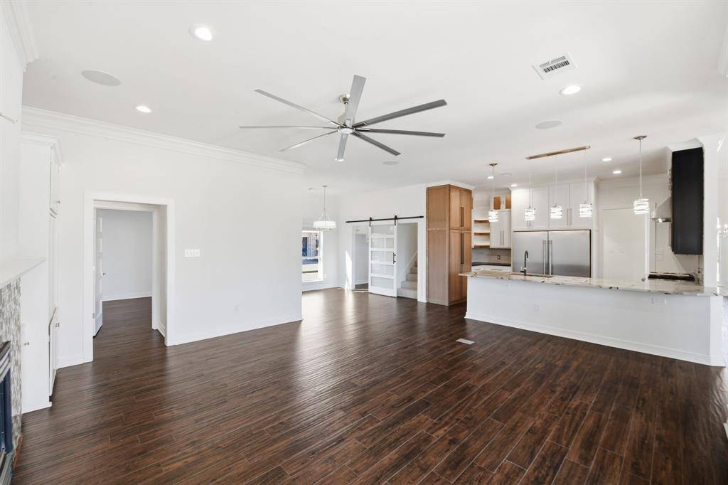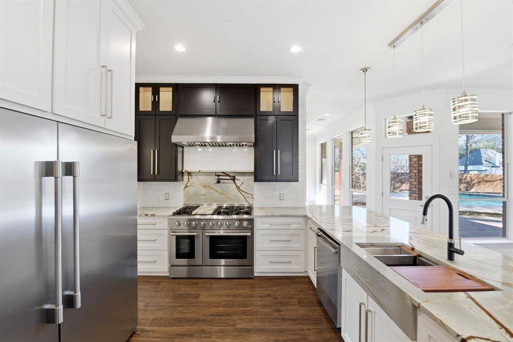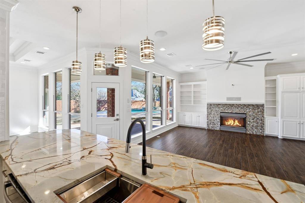 Situated on nearly half an acre in Southridge Lakes, this extensively renovated 4-bedroom home offers over 3,100 square feet with two spacious living areas, two dining areas, and a versatile bonus room designed for flexible living. The kitchen has been completely reimagined with custom cabinetry throughout, quartzite countertops, updated lighting, and a premium gas range with dual ovens. A built-in column refrigerator paired with a matching column freezer creates a true chef's layout with exceptional storage and a seamless, high-end look. All appliances have been replaced, and the cabinetry provides abundant storage with a clean, modern aesthetic while maintaining elevated finishes. The space opens seamlessly to the main living area, creating ideal flow for everyday living and entertaining. The primary suite is generously sized and offers direct walk-out access to the pool. The fully remodeled spa-inspired bathroom features dual shower heads in an oversized walk-in shower, a fireplace positioned above the soaking tub, updated tilework, new countertops, and refined modern finishes throughout. The entire home is served by a tankless water heater, providing continuous hot water and improved efficiency. The primary closet has been upgraded with custom built-ins and drawer systems for optimal organization.