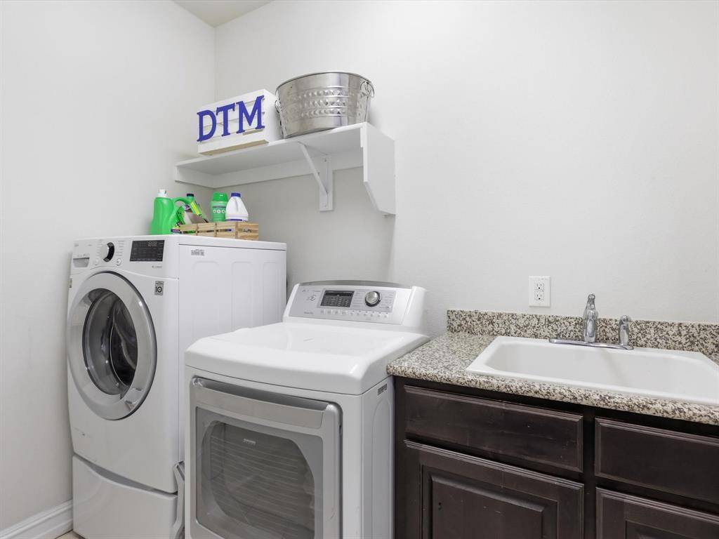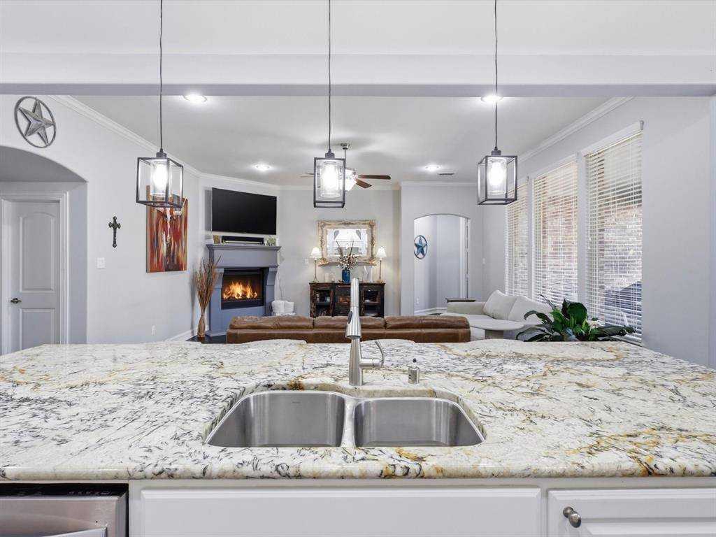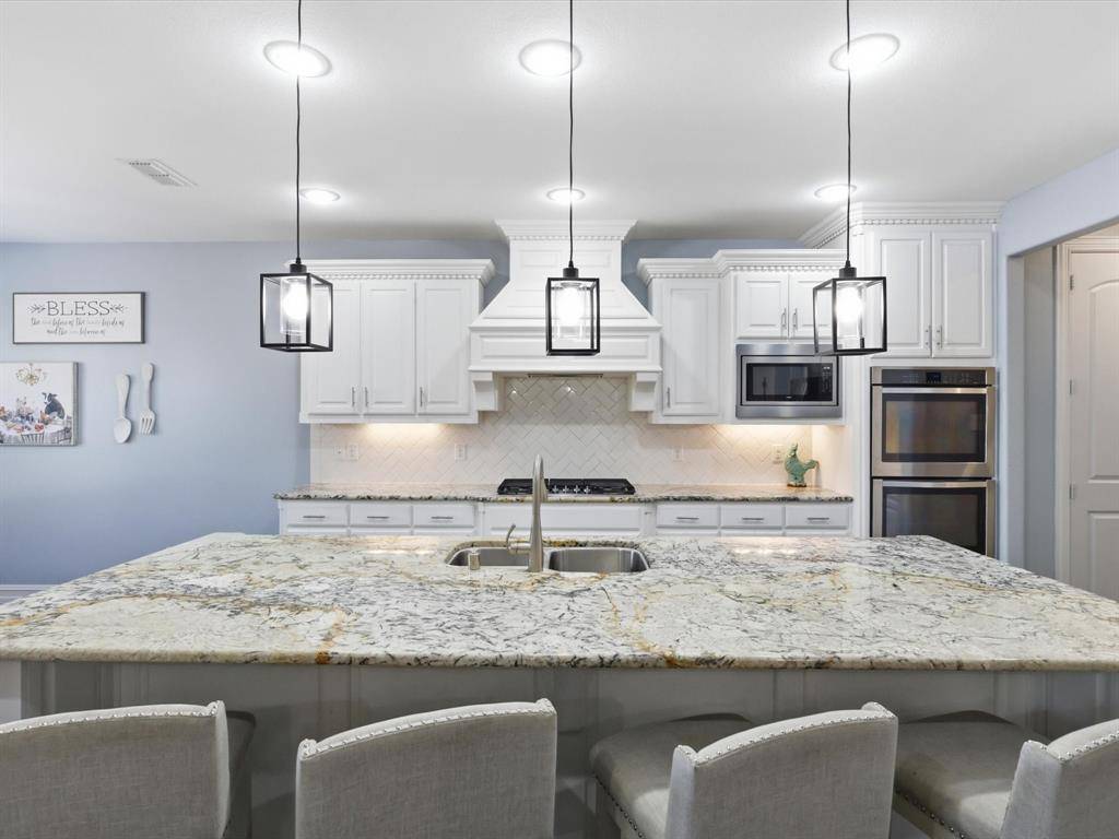 The gourmet kitchen includes granite countertops, under-cabinet lighting, large island, and butler's pantry, opening up to the main living area. The utility room features a deep sink with additional cabinetry.