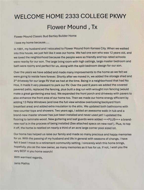 OPEN HOUSE SUNDAY MARCH 15TH 2PM TO 4PM.......WELCOME HOME....TO A TRUE FLOWER MOUND CLASSIC HOME WITH NO HOA ....THAT MARKS ALL THE BOXES HAS JUST ARRIVED...ONCE IN OVER 3 DECADES FOR THE OPPORTUNITY TO OWN THIS HOME WITH THE TRUE DEFINITION OF THE PRIDE OF OWNERSHIP AT THE HIGHEST DEGREE. NESTLED ON AMAZING HUGE OVERSIZED CORNER LOT WITH HUGE POOL SIZED BACKYARD WITH STORAGE, LARGE RV PARKING AREA, AND MORE. OPEN FLOORPLAN WITH SOARING CEILINGS, SPLIT BEDROOM DESIGN .....PLUS....RECENT NEW UPDATED MASTER BATH WITH BEAND NEW SHOWER, NEW ROOF WITH ALL NEW ENERGY EFFICIENT RADIANT DECKING MARCH 2026, NEW COMPLETE INTERIOR PAINTING, WOOD FLOORS AND MORE....SHOWS LIKE A MODEL! BE MESMERIZED BY THE CHARM AND DECLARE THIS ONE HOME BEFORE ITS GONE.