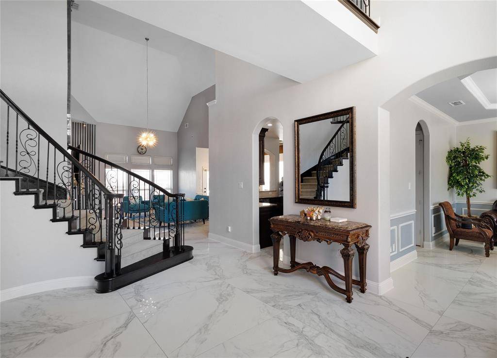 Welcome to this breathtaking luxury residence located at 1028 Spinks Ct in the heart of Flower Mound's prestigious Bella Strada community. From the moment you arrive, the circular driveway and dual three-car garage create a striking first impression. Inside, a grand foyer highlighted by a sweeping staircase, 48x48 Porcelain marble look tile flooring for elegant living and effortless entertaining.