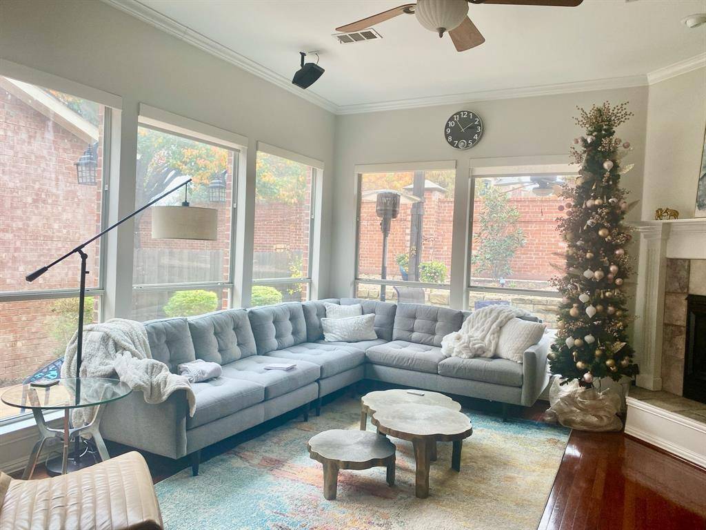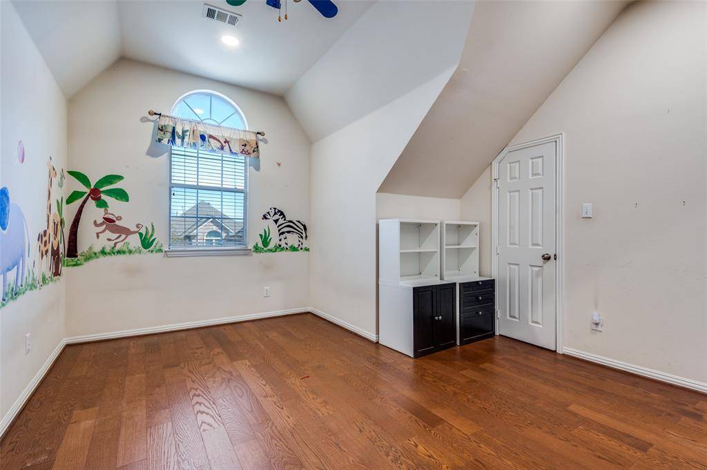 Meticulously maintained custom-built move-in ready home located in the exclusive gated community of Hackberry Creek. This 4-bedroom, 3.5-bath with Primary bedroom downstairs residence offers 3,155 square feet of thoughtfully designed living space with quality upgrades and building science concepts throughout. Open-concept floor plan with soaring ceilings and abundant natural light. Main living areas feature wood and tile flooring, a fireplace, and pre-wired surround sound. The spacious kitchen is equipped with premium KitchenAid appliances, granite countertops, and ample cabinetry. Upstairs features wood flooring and include a large game-media room providing flexible living space. Automated window shades enhance comfort and privacy. Excellent storage options include a finished under-stair storage area and a generous attic space above the two-car garage. Built with efficiency and long-term performance in mind. Features include EV charging capability, solar screens, in-wall insulation, whole-house surge protection, and a professionally installed lightning protection system. Drip irrigation system supports foundation moisture management with no known foundation issues. Access to Coppell ISD through a limited open-enrollment program.