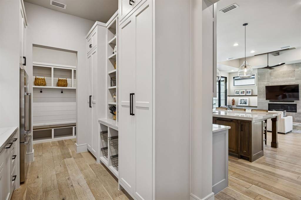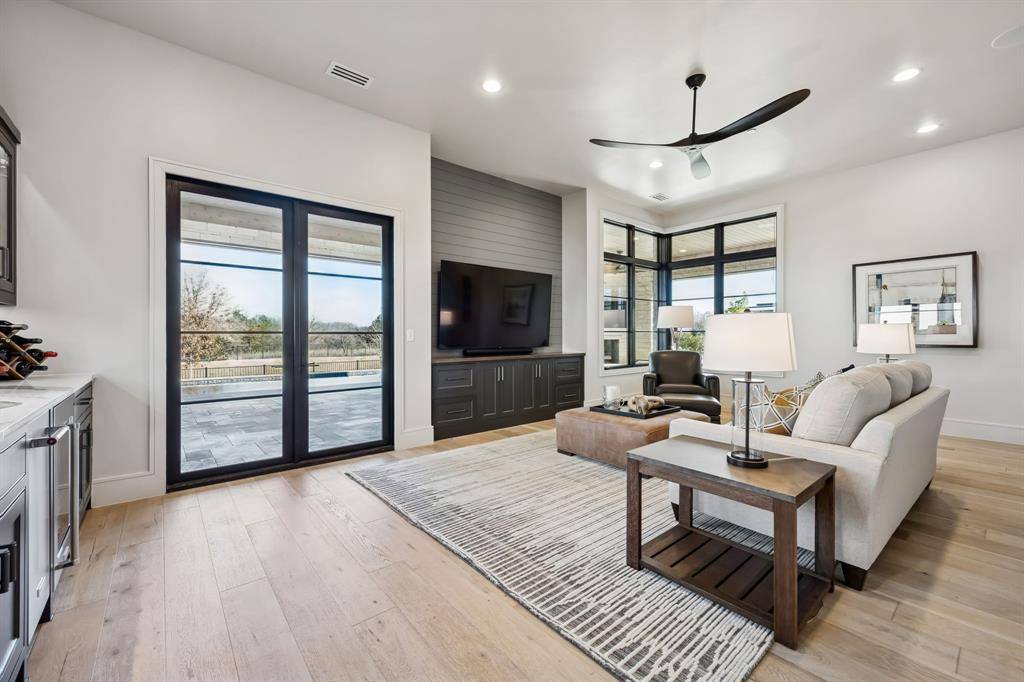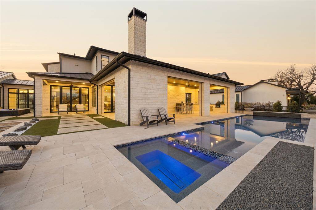A rare opportunity in gated Saddleback Estates, this Atwood Custom Homes residence sits on a sprawling one-acre lot with a private pond and a striking modern aesthetic. From the moment you arrive, a dramatic glass-door entry and a wall of windows frame views of a custom water feature, setting the tone for the exceptional design found throughout. The home offers 4 bedrooms, 4.1 baths, and a 4-car garage, with predominantly downstairs living designed for both comfort and elevated entertaining. The open-concept living room, kitchen, and breakfast area create a seamless central gathering space, while a secondary catering kitchen tucked behind the main kitchen allows for high-level entertaining with ease. A private office with a sleek glass wall delivers a modern, inspiring workspace. The game room is a destination of its own, featuring a wet bar with wine fridge and direct access to the patio, perfect for hosting and indoor-outdoor living. Step outside to a true resort-style retreat: a covered patio with built-in grill and fireplace overlooks a custom Claffey pool and spa complete with multiple water features, offering year-round enjoyment and unforgettable views. The private primary suite is a serene escape overlooking the backyard, paired with a luxurious spa-inspired bath featuring an oversized walk-in shower, soaking tub, dual vanities, and separate walk-in closets. Thoughtfully designed, impeccably built, and effortlessly stylish, this home blends modern luxury with everyday livability in one of the area's most exclusive gated communities.