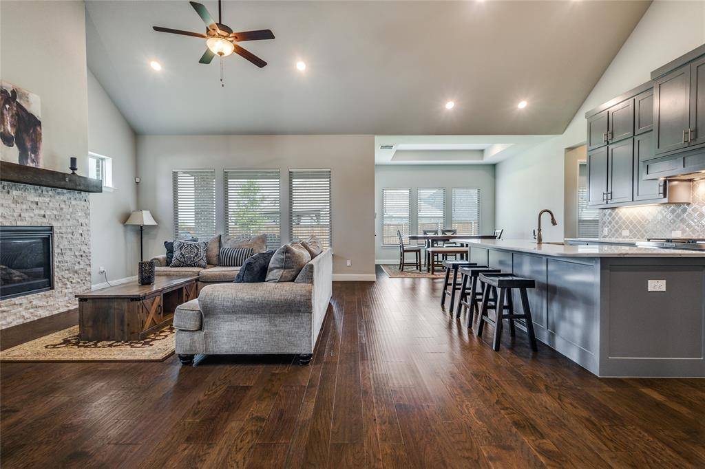 Check out this beautiful custom Drees Home on a corner-lot with NO PID or NO MUD fees. Zoned to top-rated Argyle ISD with Argyle South Elementary and Argyle HS located inside the neighborhood, as well as Liberty Christian private school within 5 miles. This 4-bed, 4-bath home offers an exceptional floorplan with soaring ceilings, updated wood-beam, designer lighting, and hardwood-style floors. The spacious living room filled with natural light boasts a stone fireplace and custom mantle and flows into a chef's kitchen featuring a large island, stainless appliances, double oven, abundant cabinetry, and walk-in pantry. The primary suite offers a newly remodeled spa-style shower and dual vanities leading into a large master closet with the large laundry space conveniently located to bedrooms. Upstairs, enjoy a generous game room and private guest suite with plenty of flex space for entertainment, workout room, or more. Additional highlights include epoxy-coated 2-car garage plus additional separate 1-car garage, plus a covered patio overlooking a meticulously landscaped large yard. Enjoy HOA community events and social clubs, included internet and tv, front yard maintenance, along with amenities including resort-style pool, fitness center, clubhouse, nature and paved walking trails, dog park, catch-and-release fishing pond, water features, and extensive preserved open space (200 acres) weaving through the community—all with quick access to FM 1171, US 377 & major highways for easy commutes to DFW airports, schools, dining & entertainment.