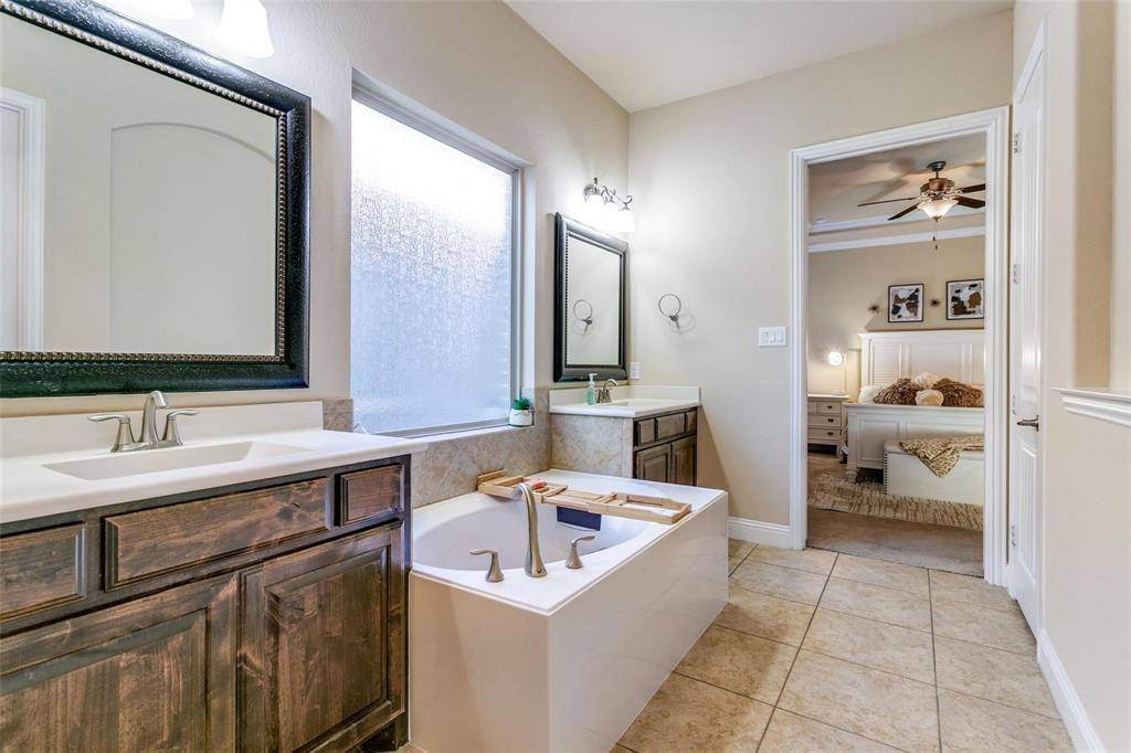 Welcome to this beautifully appointed 4-bedroom, 3.5-bath two-story home located in the highly sought-after community of Villas at Bear Creek, just minutes from DFW Airport. Perfectly positioned near US Hwy 360 and Hwy 183, this home offers exceptional convenience with effortless access to major highways, premier shopping, dining, and entertainment. Step inside to rich hardwood flooring and an elegant open-concept design filled with natural light. The spacious living area flows seamlessly into the stunning kitchen, creating an ideal setting for both everyday living and entertaining. The chef-inspired kitchen features a large center island, double ovens, built-in microwave, and an abundance of cabinetry, offering both style and functionality for cooking and hosting alike. The thoughtfully designed floor plan includes a private primary suite on the first floor, creating a serene retreat complete with an ensuite bathroom designed for comfort and relaxation. Also located on the main level is an additional full-size bedroom with its own ensuite bath, perfect for guests, extended family, or a private mother-in-law suite. A dedicated home office provides a quiet and productive workspace for those working from home. Upstairs, a spacious game room offers the perfect place for movie nights, playtime, or entertaining, along with two additional generously sized bedrooms that provide plenty of space for family or guests. Step outside to enjoy the covered patio overlooking a spacious fenced backyard, an inviting outdoor setting ideal for relaxing evenings, weekend gatherings, or simply enjoying the Texas sunshine. Combining elegant design, flexible living spaces, and an unbeatable location near DFW Airport and major highways, this move-in ready home offers both comfort and convenience in one exceptional package.