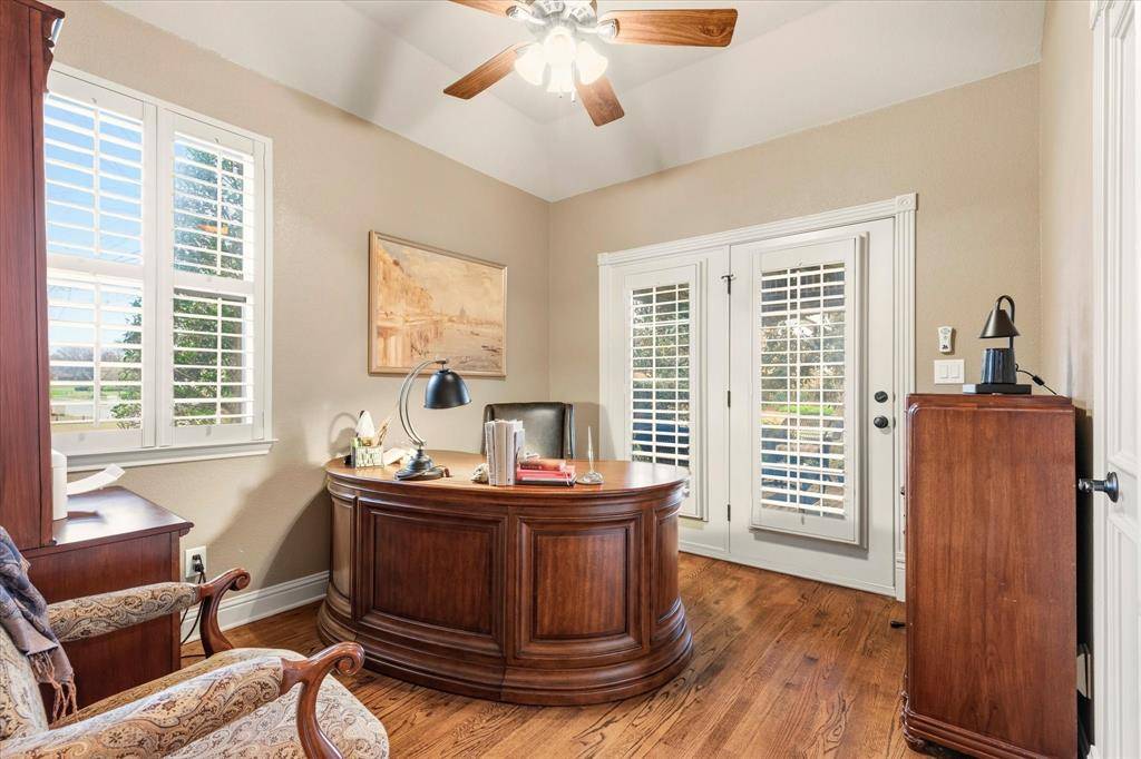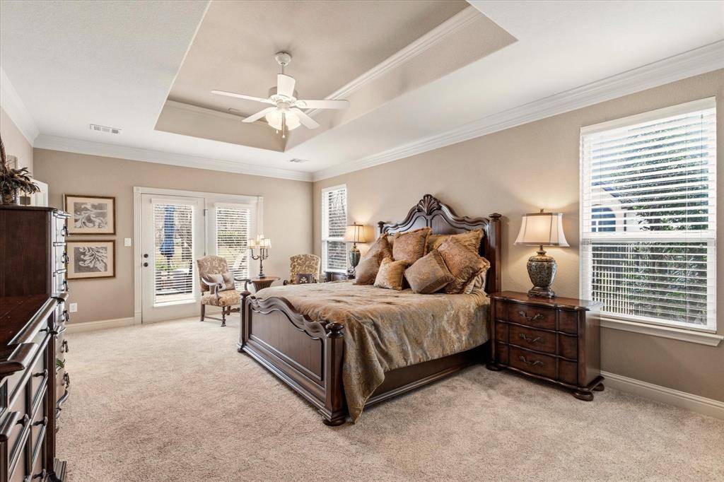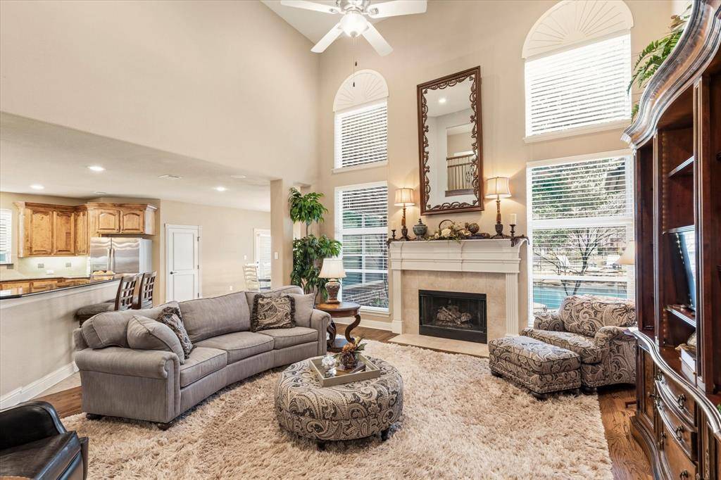 Step inside this breathtaking two-story traditional home with a pool, perfectly situated on a half-acre lot in the highly sought-after community of Sanctuary. A grand foyer with soaring 19-foot ceilings and sweeping hardwood floors welcomes you into this elegant yet functional home, where formal living and dining rooms are beautifully positioned off the entry. The home opens to an inviting entertainment space featuring a spacious family room with a cozy gas fireplace and large windows overlooking the serene outdoor oasis. The gourmet kitchen is a chef's dream, complete with granite countertops, a gas cooktop, dual ovens, under-cabinet lighting, abundant prep space, and a large walk-in pantry. The serene primary suite is thoughtfully located on the main floor and offers dual walk-in closets along with a luxurious ensuite bath featuring separate vanities, a relaxing jetted tub, and a separate shower. A secondary bedroom with a walk-in closet and patio access is also on the main floor, making it ideal for a nursery or home office. A stunning wrought-iron split staircase leads to the second floor, where you'll find a spacious game room, a media room with two-tiered seating, and three additional bedrooms—each with walk-in closets and private ensuite baths. Step outside to your backyard paradise with a firepit, where a sparkling heated saltwater pool with a tranquil waterfall feature and built-in table creates the perfect retreat. A covered pergola with a grill provides the ideal space for entertaining, while the expansive lawn offers plenty of room for kids and pets to play. Once you arrive, you may never want to leave.