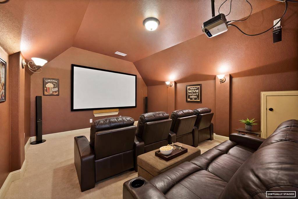 Upstairs, an open catwalk overlooks the main living area and leads to three generously sized bedrooms, two full bathrooms, a large game room, and a dedicated media room pre-wired for a projector with ample space for a sectional and bar setup.