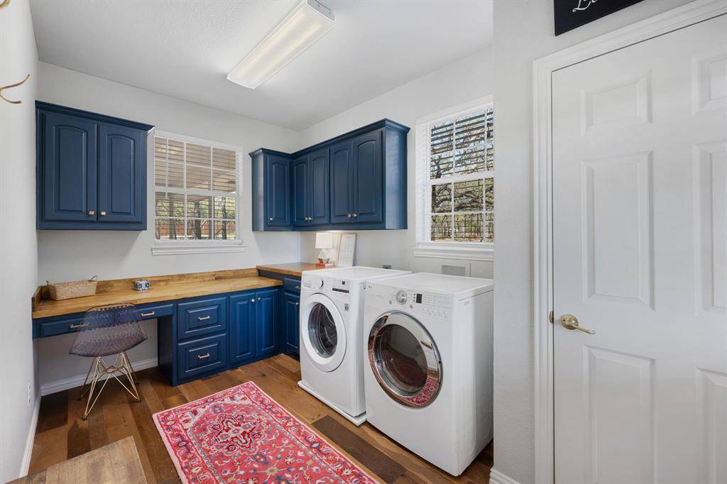 glass cooktop, double oven, farm sink and decorative lighting. The large laundry room can also double