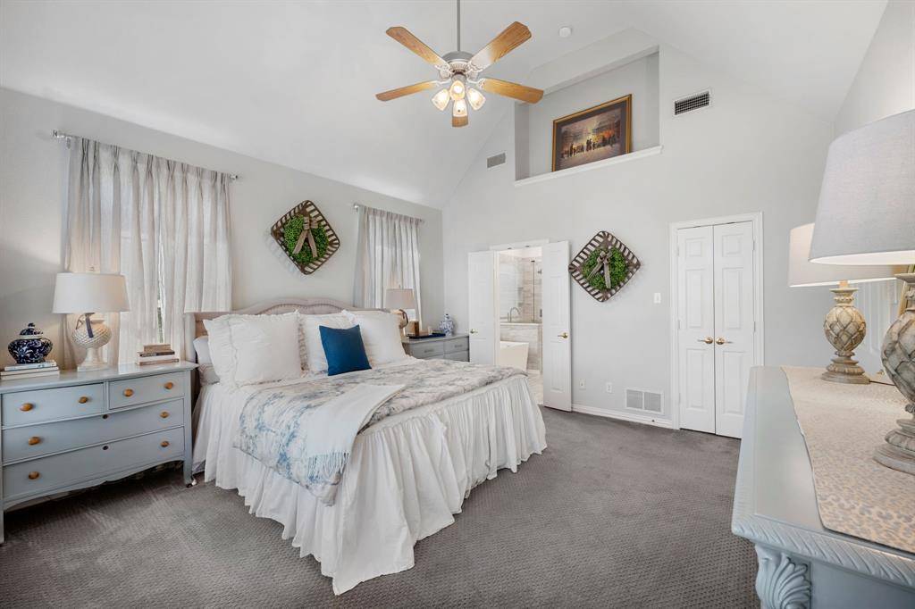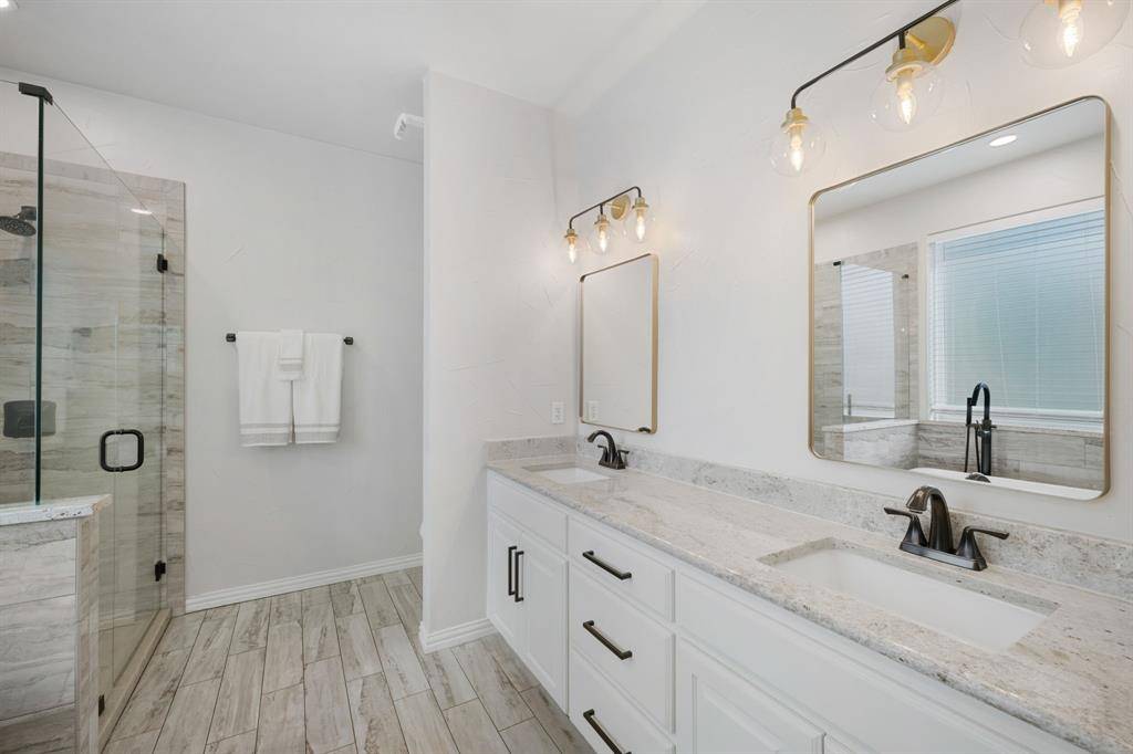 your primary ensuite with large windows overlooking the backyard, walk-in glass shower, and large