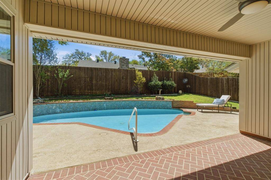 HURRY TO VIEW THIS BEAUTIFUL 4 BEDROOM HOME WITH SPARKLING SWIMMING POOL IN A PARK-LIKE SETTING JUST A SHORT WALK TO BEDFORD'S LINEAR TRAILS, BARK PARK, MEADOW PARK ATHLETIC COMPLEX AND SPRING GARDEN ELEMENTARY SCHOOL. It's Also Less Than A Mile To Outstanding Generations Park At Boys Ranch Where Your Family Can Enjoy A Fitness Center, Gymnasium, Indoor Track, Game Lounge, Indoor Pool With Slides, Hot Tub, Outdoor Water Park And More! Family Memories Will Be Made In Your Very Own Private Back Yard Oasis Where There's Ample Pool Deck Space And A Covered Patio That Help You Entertain Family And Friends With Ease. There's Yard Space For Children And Pets Too. Upon Entering This Beautiful Home, You're Greeted By Gorgeous Hardwood Flooring That Extends Throughout Where There's Not Ceramic Tile. Every Day Will Feel Like Vacation As You Experience The Beautiful Pool View From The Living Area That Offers A Brick Fireplace, Built-In Cabinetry, Crown Moulding And Recessed Lighting. You'll Appreciate The Kitchen's Abundant Cabinetry, Granite Countertops, Tile Backsplash, Under-Cabinet Lighting, Convection Range And Stainless Refrigerator That Stays. You Have Choices For Dining, Either The Bright, Cheery Breakfast Area That Overlooks The Pool Or The Formal Dining Room That's Accented By Crown Moulding. The Sizable Owners Suite Offers A Raised Ceiling And Plantation Shutters While A Skylight Brightens The Owner's Bath That Features Separate Vanities, Remodeled Shower, Garden Tub And Walk-In Closet. Split Secondary Bedrooms Boast Walk-In Closets, Plantation Shutters And Ceiling Fans And Share An Attractive Bath With Ample Countertop And Storage Space. New HVAC, Pool Pump And Microwave Are Added Benefits. Come Take A Look!