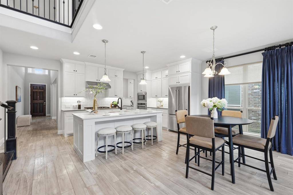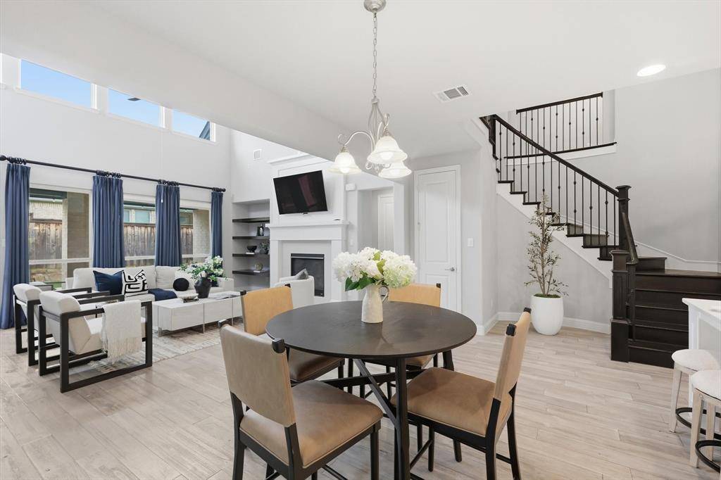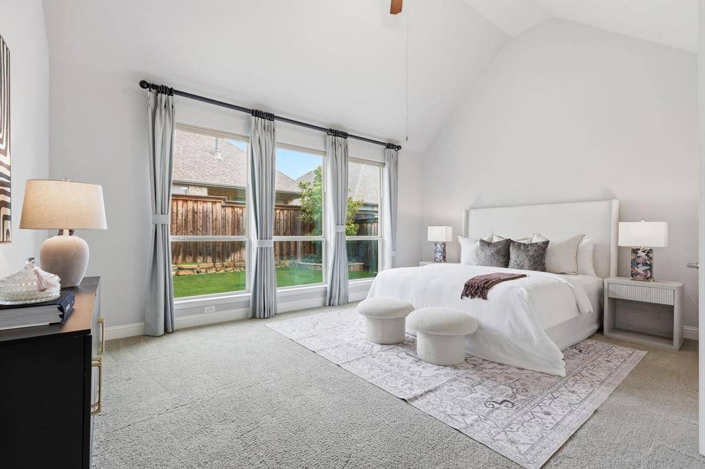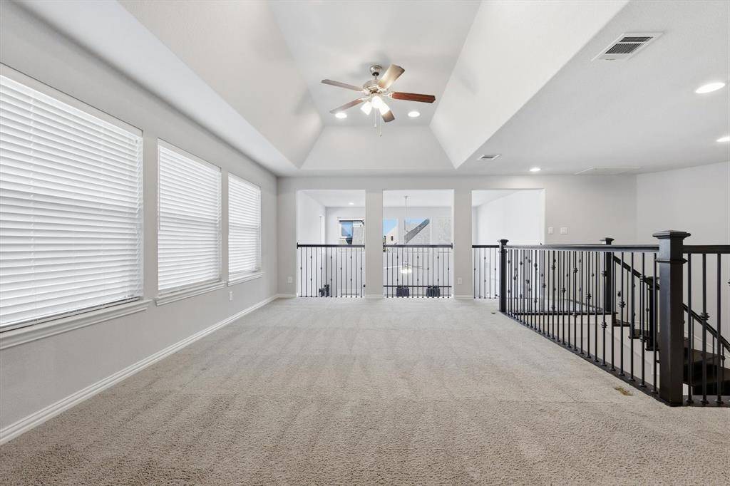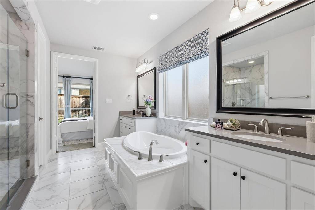 Welcome to this exquisite 5-bedroom, 4.5-bath luxury residence spanning 3832 sq ft, perfectly situated in the prestigious Las Colinas. This home is a showcase of refined architecture and modern livability. Step inside the grand two-story foyer, soaring ceilings, and abundant natural light create an unforgettable first impression. The open-concept living area is anchored by a spacious family room with dramatic ceiling height—ideal for both everyday comfort and stylish entertaining. The chef-inspired kitchen boasts a oversized island with quartz countertops, stainless steel appliances, upper cabinetry, and a walk-in pantry—designed to delight culinary enthusiasts and hosts alike. The first-floor primary suite offers a tranquil escape with a spa-style bath, complete with a soaking tub, frameless glass shower, dual vanities, and an expansive walk-in closet. Also downstairs, you'll find a dedicated home office and a generously sized guest suite with its own private bath—perfect for multi-generational living. Upstairs delivers three additional bedrooms plus a large game room and a separate media room — an ideal plan for multigenerational living, work-from-home flexibility and dedicated entertainment spaces. Outside, a covered patio opens to a private, low-maintenance backyard with concrete terrace, lawn strip and stone border perfect for dining, play and pets. Close to shopping, dining, trails and major commute routes