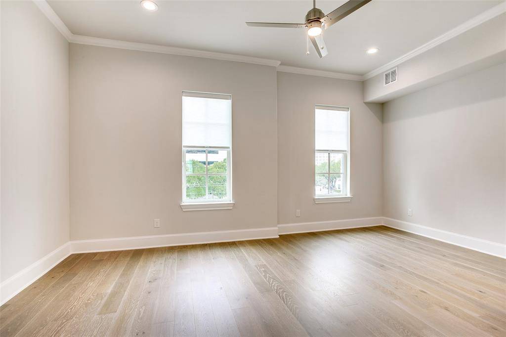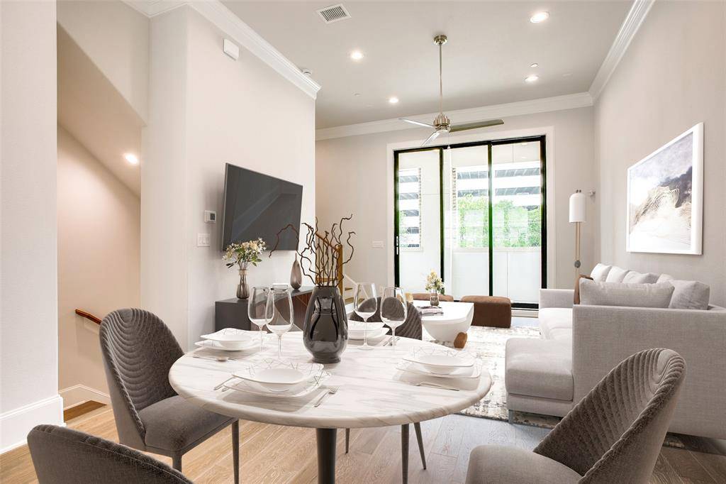 This MOVE-IN READY 3-bed, 3.5-bath townhome by InTown Homes offers a prime location just steps from dining, entertainment, and the DART. Commuting is a breeze with quick access to major highways, making it easy to explore the entire metroplex. Inside, enjoy a light-filled open floor plan, sophisticated finishes, and engineered hardwood floors throughout. The main level features soaring 12-foot ceilings and a 10-foot sliding panel door that opens to a private balcony. The sleek kitchen boasts Fisher & Paykel appliances, quartz countertops, designer tile backsplash, and soft-close cabinetry. Unwind in the spacious primary suite with a spa-like bathroom and expansive walk-in closet. The stunning rooftop terrace provides an ideal space for entertaining. The community will also feature a lush courtyard and resort-style pool. PLEASE NOTE ALL OPEN HOUSES WILL BE HELD AT 5453 PATTERSON COURT.
