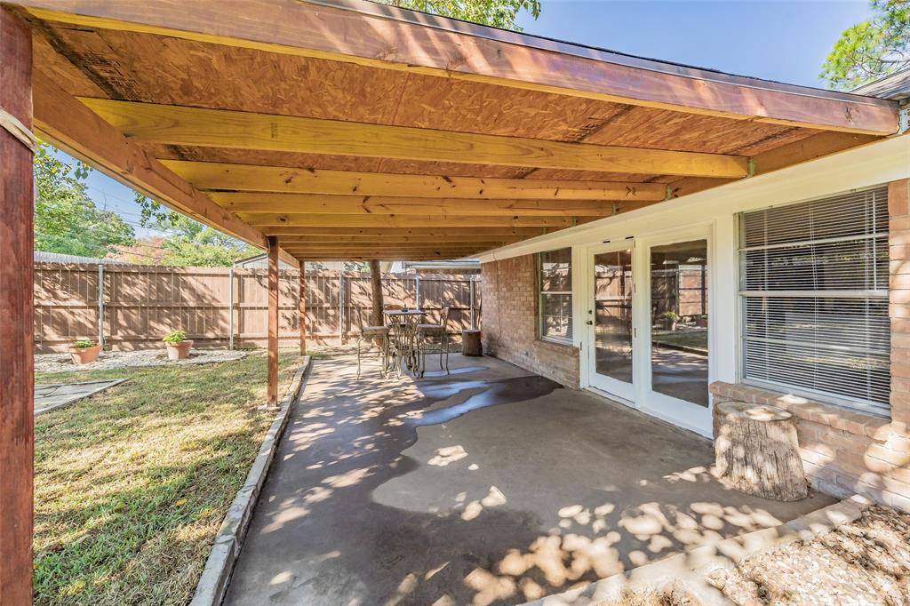The backyard is generously sized with mature trees and established landscaping, complete with a nice covered patio and an additional large patio area ideal for outdoor enjoyment, gatherings, or relaxing evenings.