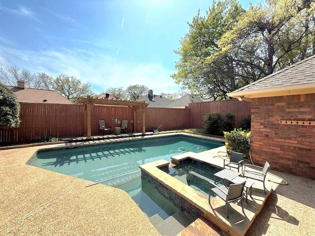 Tucked away on a quiet cul-de-sac in highly rated HEB ISD, this custom home offers resort-style living without ever leaving the neighborhood. The pool and spa set the tone, while the interior delivers with elevated details throughout—custom ceiling treatments, crown molding, wainscoting, and designer finishes. The kitchen features granite countertops and double ovens, perfect for both everyday living and entertaining. Enjoy cozy evenings by the fireplace or entertain with ease thanks to a stylish wet bar that adds both function and flair. Thoughtfully designed with space and flexibility in mind, the home offers 4 bedrooms, including a private suite ideal for guests, along with an additional living area. A detached two-car garage provides both privacy and convenience, offering quick, easy access to the home. Impeccably landscaped and meticulously maintained, this home was built to impress—and continues to do so.