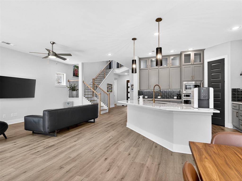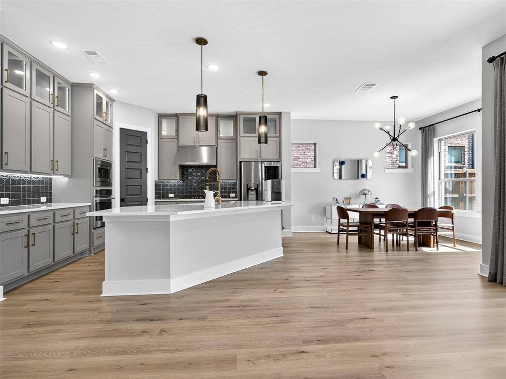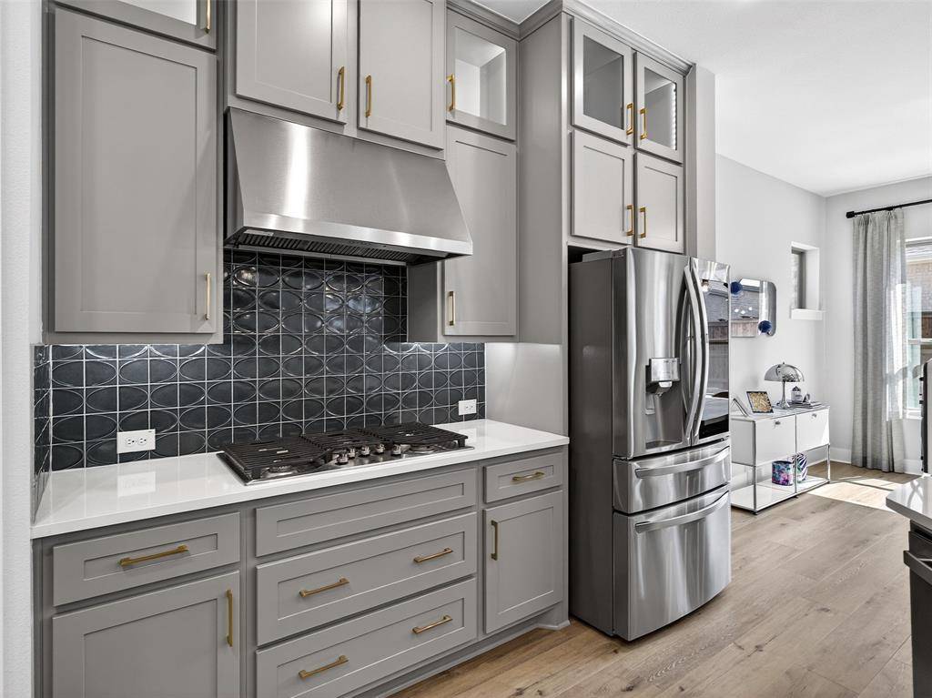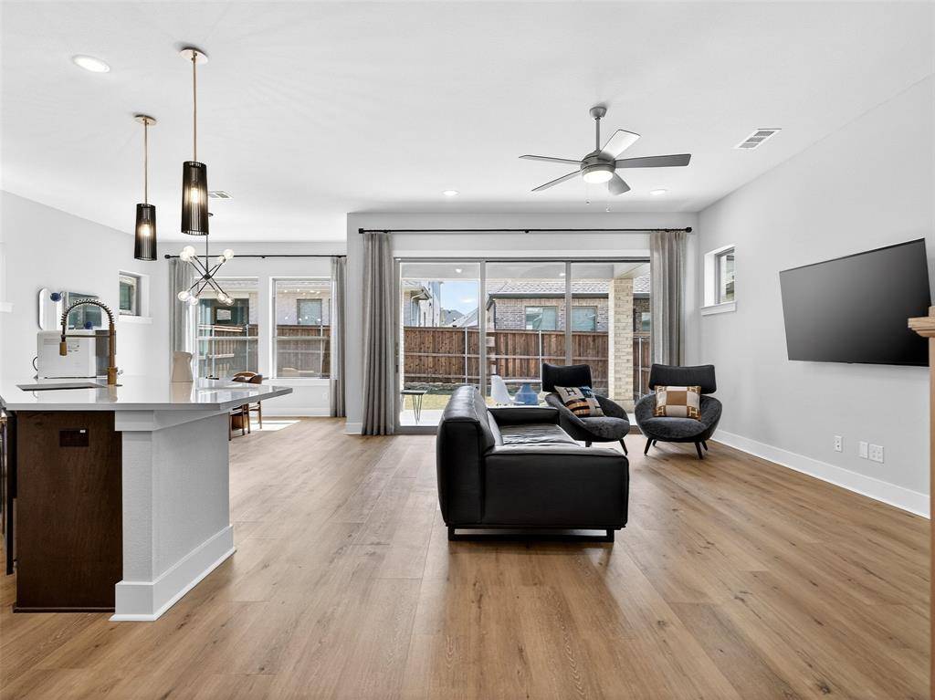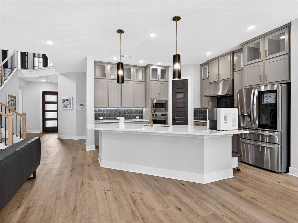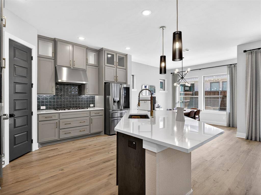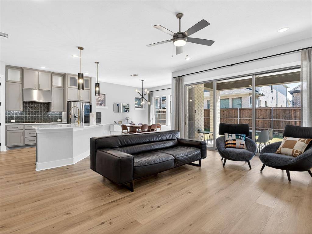 Designed with both comfort and entertaining in mind, this thoughtfully planned home features an expansive open-concept layout with soaring ceilings and an abundance of natural light. The gourmet kitchen is a true centerpiece, showcasing custom-painted cabinetry, a spacious island with pristine quartz countertops, stainless steel appliances, and a gas cooktop. It seamlessly connects to the dining and family areas, creating the perfect setting for gatherings. Just off the living space, sliding doors open to an extended covered patio, inviting you to relax in the shade or enjoy outdoor dining.