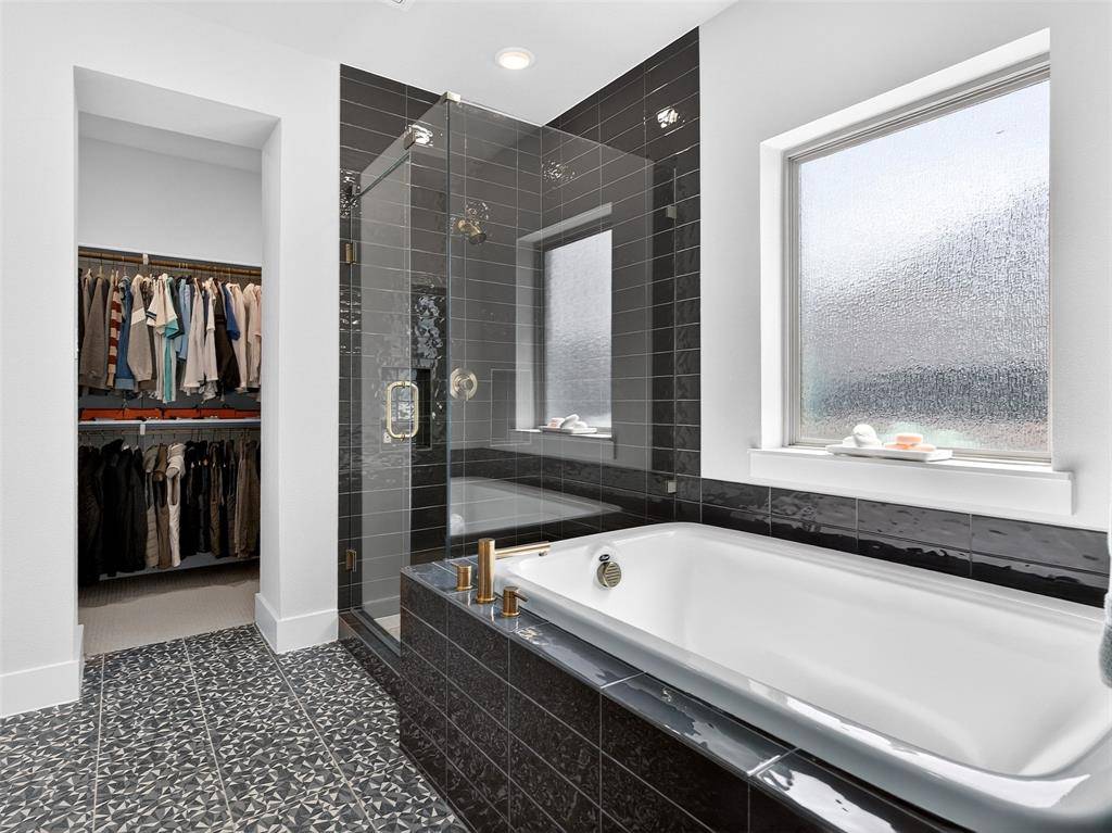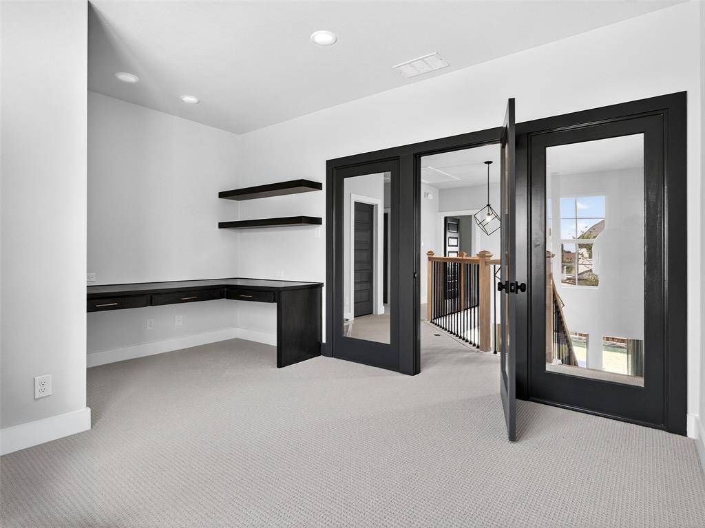 The Owner's Retreat offers a serene escape, featuring an en suite bath with dual vanities, a soaking tub, a separate walk-in shower with body sprays, and a generous walk-in closet. A dedicated home office with a built-in desk provides a quiet, light-filled workspace, while additional storage—including a mudroom closet and extended garage space—adds everyday convenience.