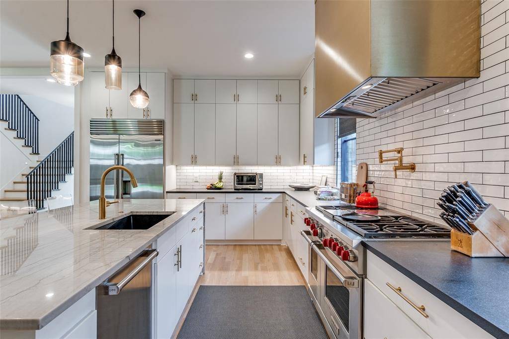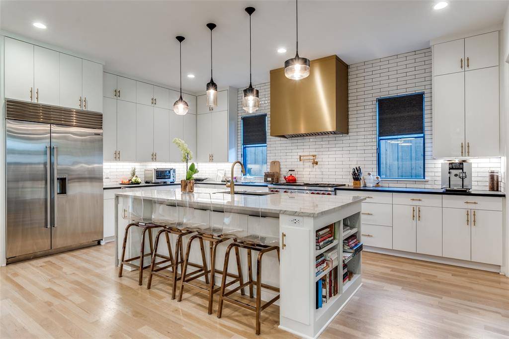Welcome to 7229 Haverford – a thoughtfully reimagined custom home by Ryan Bozeman Homes. Built in 2020 and zoned to highly sought-after Lakewood Elementary, this stunning home blends sophisticated design, modern luxury and everyday functionality in one of Dallas's most desirable neighborhoods. Step inside to find 10-foot ceilings, rich white oak hardwood floors and abundant natural light throughout. The first floor features a dedicated home office and a beautifully open-concept layout, ideal for effortless entertaining and everyday living. The chef's kitchen is a true showpiece - featuring Wolf appliances, a Sub-Zero wine fridge, custom soft-close cabinetry, designer tilework, a custom brass vent hood, pot filler and a dramatic quartzite waterfall island with seating. The kitchen flows into the spacious living room with a custom gas fireplace, built-in cabinetry and high-efficiency windows offering both comfort and energy savings. Enjoy immersive sound with a Sonos system installed throughout the home.