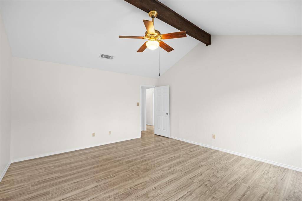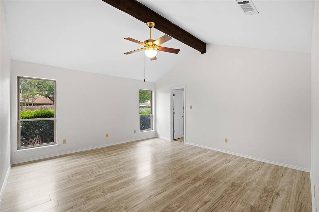 Classic ranch style meets thoughtful updates in this well-maintained single-story home, ideally located in the heart of the metroplex for easy access to everything you need. From the moment you arrive, you'll appreciate the care and improvements, including a recently replaced roof for added efficiency and peace of mind. Step inside to a warm and inviting living space featuring vaulted ceilings, rich wood flooring, and a striking brick accent wall with a wood-burning fireplace—the perfect focal point for cozy evenings. Just off the kitchen, the casual dining area with a built-in buffet makes hosting effortless, whether it's everyday meals or special gatherings. The kitchen is designed for those who love to cook, offering double ovens, a cooktop, granite countertops, and abundant cabinet and prep space. The primary suite continues the charm with vaulted ceilings, an exposed beam, and a spacious en suite bath complete with dual vanities, a large walk-in shower, and a walk-in closet. Two additional bedrooms provide flexibility for guests, a home office, or creative space, along with a full bath. Outdoor living is just as inviting, with an expansive covered wraparound patio ideal for entertaining, relaxing, or dining al fresco. The fully fenced backyard offers privacy for pets and play, plus a storage shed for tools and equipment.