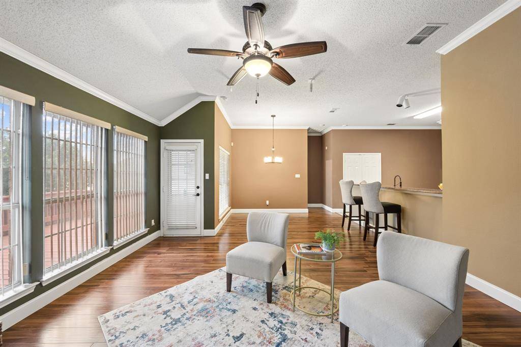 The kitchen is a standout with granite countertops, stainless steel appliances, a large island, breakfast bar, and plenty of prep space for cooking and gathering. High ceilings, wood look flooring, and a stunning wall of windows across the back of the home fill the space with natural light and offer lovely views of the private backyard and deck—perfect for relaxing or hosting guests.