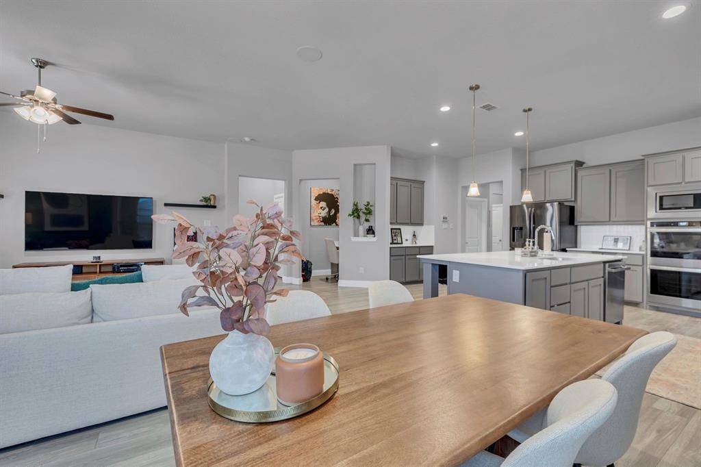 This home features all of your favorite upgrades. Open kitchen with tons of counter space, quartz countertops, oversized island, gas stovetop, and double-oven. Ceramic tile plank flooring throughout the home. Built-in surround sound system in the main living areas and backyard. Enjoy your large, corner lot backyard from the massively extended patio equipped with a built-in gas line for the grill. Community pool and park are right down the street. Other popular features include smart home technology, security system, tankless water heater, mudroom, sprinkler system, and office nook. Neighborhood located in the esteemed Northwest I.S.D. and close to historic downtown Denton, Texas Motor Speedway, Tangier Outlets, Roanoke Main Street, and Flower Mound shopping and restaurants.