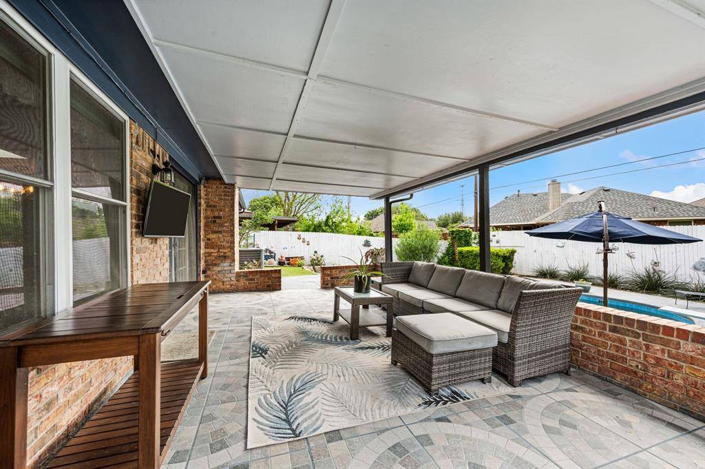 Welcome to this beautiful single-story home in the heart of HEB offering the perfect blend of comfort, flexibility, and location! Step inside to find spacious living areas & generously sized bedrooms ready for move-in. The kitchen shines with granite countertops, tile backsplash, and updated Samsung smart appliances, while the bathrooms feature elegant marble finishes, new fixtures, lighting, & tile. The oversized primary suite is a true retreat, complete with high sinks, a large walk-in closet, & an expansive linen storage area. A standout feature of the home is the versatile game room with wet bar, ideal as a second living area, office, or even an additional bedroom. Out back, enjoy your own private oasis with a covered patio, new patio roof with custom tile flooring, & a sparkling pool with recently resurfaced deck, new filter, & updated plumbing, perfect for entertaining or relaxing year-round. The backyard also features pavers, an extended brick walkway, storage sheds. This home has been extensively updated with major improvements, including a new Class 3 impact-resistant roof, new gutters with leaf guards, fresh interior & exterior paint, luxury vinyl flooring throughout, new fence & gates, & updated electrical panel. Energy efficiency is a highlight with solar panels producing approximately 80% of electricity (expandable). Additional upgrades include a skylight & living room ceiling enhancement, ceiling fans & updated lighting, new blinds, laundry room cabinets, recessed TV wiring, and a renovated recreation room bar area. A large 66x14 concrete parking pad provides ample space for RV, boat, or additional vehicles. Other features include a jetted Jacuzzi tub, walk-in closets in all bedrooms, Honeywell smart thermostat, Govee LED holiday lighting,& a bathroom fan with LED lighting and Bluetooth speaker. Conveniently located between Dallas and Fort Worth with easy access to DFW Airport & nearby parks like Chisholm Park, this home truly has it all!