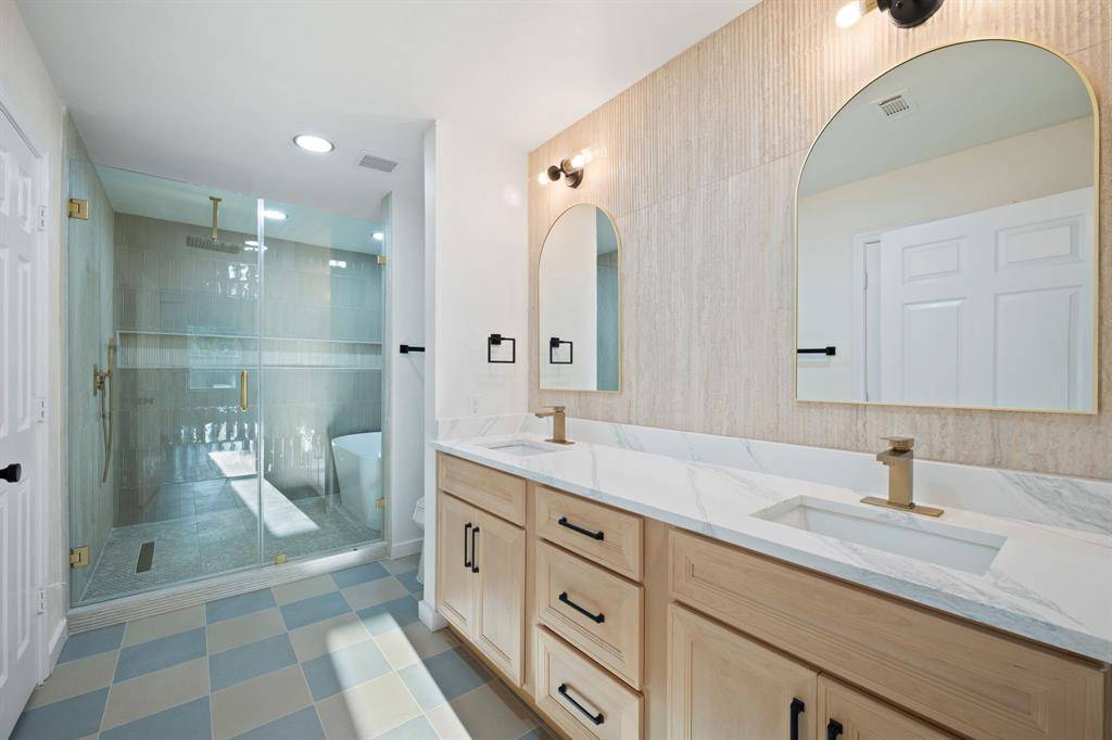 STUNNING fully renovated 3-bedroom, 2-bath, 2,065 sq ft home in a highly desirable North Bedford location! From the layout to the finishes, this open-concept, split-bedroom home has been upgraded in every way. The complete interior and exterior remodel includes a new roof, new windows, custom cabinetry throughout, LVP flooring, carpet, fresh interior and exterior paint, quartz countertops, LED recessed lighting, matte black and gold fixtures, and more. The chef-quality kitchen features waterfall island, custom natural wood cabinetry with soft-close hinges, quartz countertops, and stainless steel appliances. The spacious primary bedroom includes two walk-in closets and recessed lighting. The spa-worthy ensuite bathroom showcases dual vanities, custom cabinetry, quartz countertops, and a spa-inspired walk-in shower suite with a free-standing tub, multiple shower heads, wands, and a rain head. Fully renovated guest bath add to the home's appeal. The outdoor space includes mature trees and a large backyard ideal for relaxing or entertaining. Located minutes from parks, shopping, dining, and major roadways. Award-winning HEB ISD. Come see YOUR new home today!